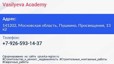 Vasilyeva Academy по адресу 141202, Московская область, Пушкино, Просвещения, 13 к2 в дальнейшем Организация, размещена в следующих категориях: