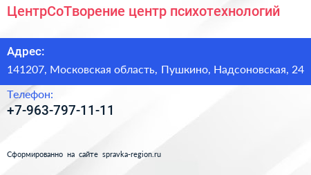 ЦентрСоТворение, центр психотехнологий по адресу 141207, Московская область, Пушкино, Надсоновская, 24 в дальнейшем Организация, размещена в следующих категориях: