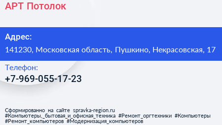 АРТ Потолок по адресу 141230, Московская область, Пушкино, Некрасовская, 17 в дальнейшем Организация, размещена в следующих категориях: