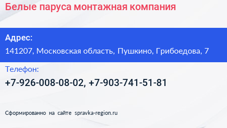 Белые паруса, монтажная компания по адресу 141207, Московская область, Пушкино, Грибоедова, 7 в дальнейшем Организация, размещена в следующих категориях: