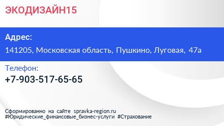 ЭКОДИЗАЙН15 по адресу 141205, Московская область, Пушкино, Луговая, 47а в дальнейшем Организация, размещена в следующих категориях: