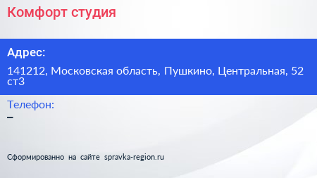 Комфорт, студия по адресу 141212, Московская область, Пушкино, Центральная, 52 ст3 в дальнейшем Организация, размещена в следующих категориях:
