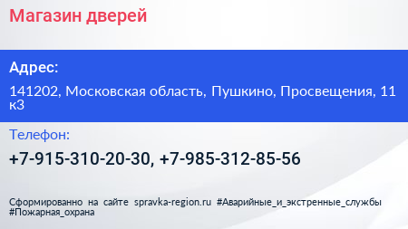 Магазин дверей по адресу 141202, Московская область, Пушкино, Просвещения, 11 к3 в дальнейшем Организация, размещена в следующих категориях: