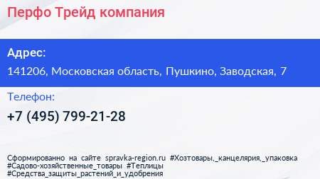 Перфо Трейд, компания по адресу 141206, Московская область, Пушкино, Заводская, 7 в дальнейшем Организация, размещена в следующих категориях:
