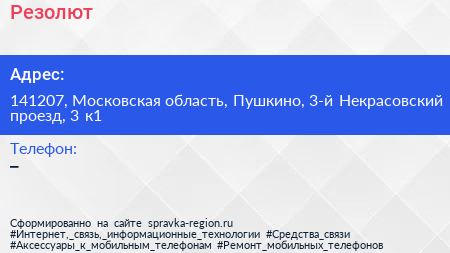 Резолют по адресу 141207, Московская область, Пушкино, 3-й Некрасовский проезд, 3 к1 в дальнейшем Организация, размещена в следующих категориях: