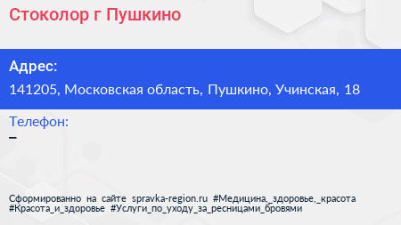 Стоколор, г. Пушкино по адресу 141205, Московская область, Пушкино, Учинская, 18 в дальнейшем Организация, размещена в следующих категориях: