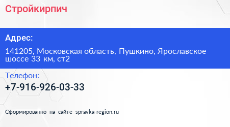 Стройкирпич по адресу 141205, Московская область, Пушкино, Ярославское шоссе 33 км, ст2 в дальнейшем Организация, размещена в следующих категориях: