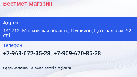 Вестмет, магазин по адресу 141212, Московская область, Пушкино, Центральная, 52 ст1 в дальнейшем Организация, размещена в следующих категориях: