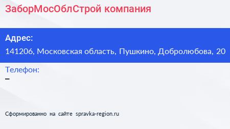 ЗаборМосОблСтрой, компания по адресу 141206, Московская область, Пушкино, Добролюбова, 20 в дальнейшем Организация, размещена в следующих категориях: