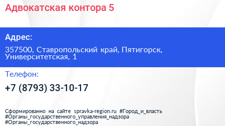 Адвокатская контора №5 по адресу 357500, Ставропольский край, Пятигорск, Университетская, 1 в дальнейшем Организация, размещена в следующих категориях: