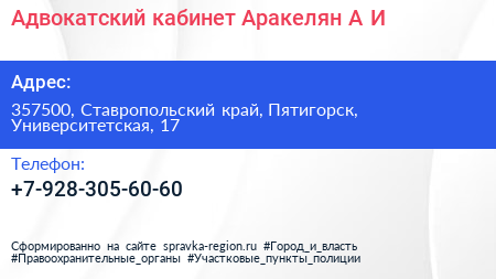 Адвокатский кабинет Аракелян А.И. по адресу 357500, Ставропольский край, Пятигорск, Университетская, 17 в дальнейшем Организация, размещена в следующих категориях: