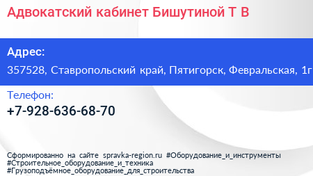Адвокатский кабинет Бишутиной Т.В. по адресу 357528, Ставропольский край, Пятигорск, Февральская, 1г в дальнейшем Организация, размещена в следующих категориях: