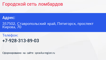 Городской, сеть ломбардов по адресу 357502, Ставропольский край, Пятигорск, проспект Кирова, 70 в дальнейшем Организация, размещена в следующих категориях: