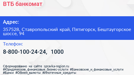 ВТБ, банкомат по адресу 357528, Ставропольский край, Пятигорск, Бештаугорское шоссе, 94 в дальнейшем Организация, размещена в следующих категориях: