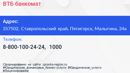 ВТБ, банкомат по адресу 357502, Ставропольский край, Пятигорск, Малыгина, 24а в дальнейшем Организация, размещена в следующих категориях: