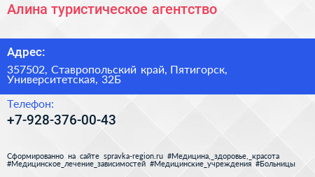 Алина, туристическое агентство по адресу 357502, Ставропольский край, Пятигорск, Университетская, 32Б в дальнейшем Организация, размещена в следующих категориях: