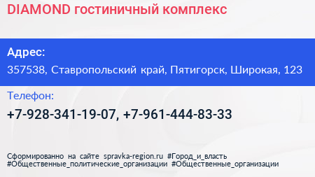 DIAMOND, гостиничный комплекс по адресу 357538, Ставропольский край, Пятигорск, Широкая, 123 в дальнейшем Организация, размещена в следующих категориях: