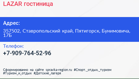 LAZAR, гостиница по адресу 357502, Ставропольский край, Пятигорск, Бунимовича, 17Б в дальнейшем Организация, размещена в следующих категориях: