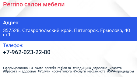 Perrino, салон мебели по адресу 357528, Ставропольский край, Пятигорск, Ермолова, 40 ст1 в дальнейшем Организация, размещена в следующих категориях: