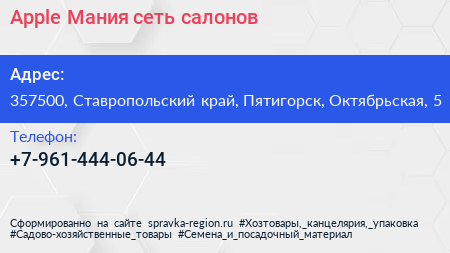 Apple Мания, сеть салонов по адресу 357500, Ставропольский край, Пятигорск, Октябрьская, 5 в дальнейшем Организация, размещена в следующих категориях:
