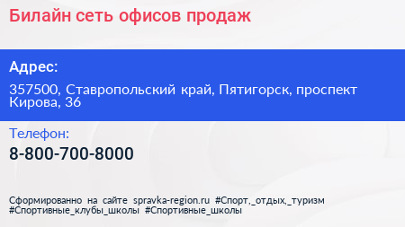 Билайн, сеть офисов продаж по адресу 357500, Ставропольский край, Пятигорск, проспект Кирова, 36 в дальнейшем Организация, размещена в следующих категориях: