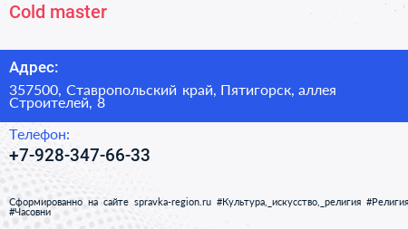 Cold master по адресу 357500, Ставропольский край, Пятигорск, аллея Строителей, 8 в дальнейшем Организация, размещена в следующих категориях: