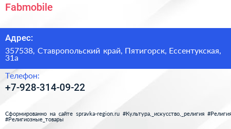 Fabmobile по адресу 357538, Ставропольский край, Пятигорск, Ессентукская, 31а в дальнейшем Организация, размещена в следующих категориях: