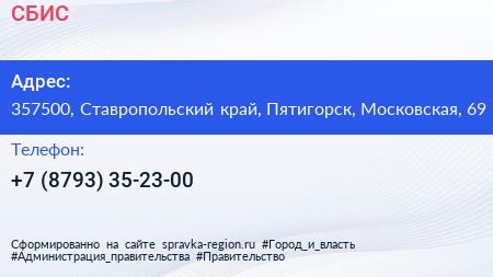 СБИС по адресу 357500, Ставропольский край, Пятигорск, Московская, 69 в дальнейшем Организация, размещена в следующих категориях: