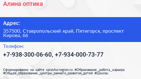 Алина, оптика по адресу 357500, Ставропольский край, Пятигорск, проспект Кирова, 66 в дальнейшем Организация, размещена в следующих категориях: