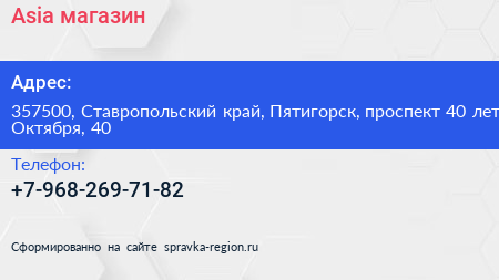 Asia, магазин по адресу 357500, Ставропольский край, Пятигорск, проспект 40 лет Октября, 40 в дальнейшем Организация, размещена в следующих категориях: