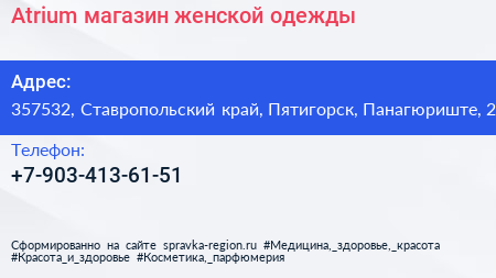 Atrium, магазин женской одежды по адресу 357532, Ставропольский край, Пятигорск, Панагюриште, 2 в дальнейшем Организация, размещена в следующих категориях: