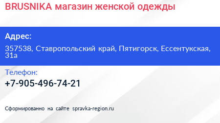 BRUSNIKA, магазин женской одежды по адресу 357538, Ставропольский край, Пятигорск, Ессентукская, 31а в дальнейшем Организация, размещена в следующих категориях: