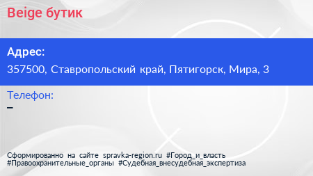 Beige, бутик по адресу 357500, Ставропольский край, Пятигорск, Мира, 3 в дальнейшем Организация, размещена в следующих категориях: