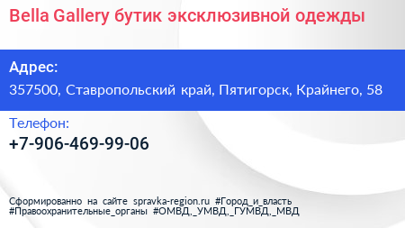 Bella Gallery, бутик эксклюзивной одежды по адресу 357500, Ставропольский край, Пятигорск, Крайнего, 58 в дальнейшем Организация, размещена в следующих категориях: