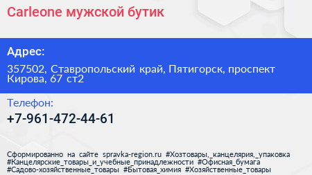 Carleone, мужской бутик по адресу 357502, Ставропольский край, Пятигорск, проспект Кирова, 67 ст2 в дальнейшем Организация, размещена в следующих категориях: