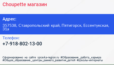 Choupette, магазин по адресу 357538, Ставропольский край, Пятигорск, Ессентукская, 31а в дальнейшем Организация, размещена в следующих категориях: