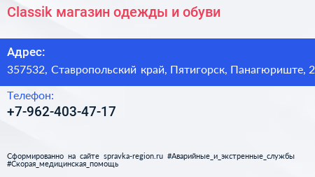 Classik, магазин одежды и обуви по адресу 357532, Ставропольский край, Пятигорск, Панагюриште, 2 в дальнейшем Организация, размещена в следующих категориях: