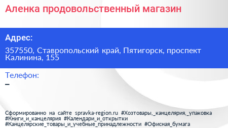 Аленка, продовольственный магазин по адресу 357550, Ставропольский край, Пятигорск, проспект Калинина, 155 в дальнейшем Организация, размещена в следующих категориях: