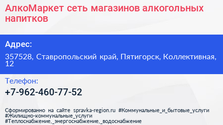 АлкоМаркет, сеть магазинов алкогольных напитков по адресу 357528, Ставропольский край, Пятигорск, Коллективная, 12 в дальнейшем Организация, размещена в следующих категориях: