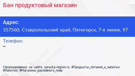 Бан, продуктовый магазин по адресу 357560, Ставропольский край, Пятигорск, 7-я линия, 97 в дальнейшем Организация, размещена в следующих категориях:
