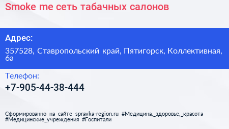 Smoke me, сеть табачных салонов по адресу 357528, Ставропольский край, Пятигорск, Коллективная, 6а в дальнейшем Организация, размещена в следующих категориях: