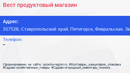 Вест, продуктовый магазин по адресу 357528, Ставропольский край, Пятигорск, Февральская, 3в в дальнейшем Организация, размещена в следующих категориях: