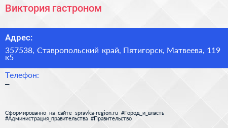 Виктория, гастроном по адресу 357538, Ставропольский край, Пятигорск, Матвеева, 119 к5 в дальнейшем Организация, размещена в следующих категориях: