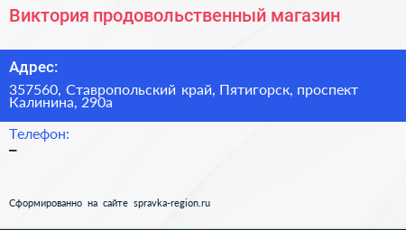 Виктория, продовольственный магазин по адресу 357560, Ставропольский край, Пятигорск, проспект Калинина, 290а в дальнейшем Организация, размещена в следующих категориях: