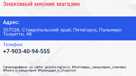 Знакомый мясник, магазин по адресу 357528, Ставропольский край, Пятигорск, Пальмиро Тольятти, 48 в дальнейшем Организация, размещена в следующих категориях: