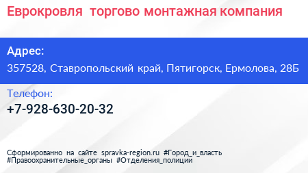 Еврокровля+, торгово-монтажная компания по адресу 357528, Ставропольский край, Пятигорск, Ермолова, 28Б в дальнейшем Организация, размещена в следующих категориях: