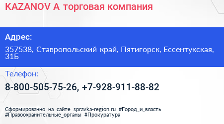 KAZANOV.A., торговая компания по адресу 357538, Ставропольский край, Пятигорск, Ессентукская, 31Б в дальнейшем Организация, размещена в следующих категориях: