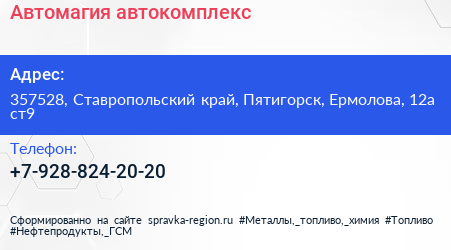 Автомагия, автокомплекс по адресу 357528, Ставропольский край, Пятигорск, Ермолова, 12а ст9 в дальнейшем Организация, размещена в следующих категориях:
