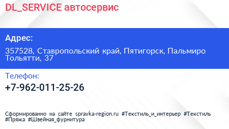 DL_SERVICE, автосервис по адресу 357528, Ставропольский край, Пятигорск, Пальмиро Тольятти, 37 в дальнейшем Организация, размещена в следующих категориях: