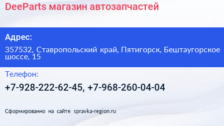 DeeParts, магазин автозапчастей по адресу 357532, Ставропольский край, Пятигорск, Бештаугорское шоссе, 15 в дальнейшем Организация, размещена в следующих категориях: